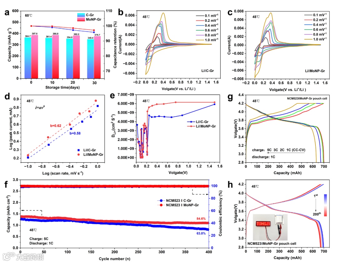 图3 C-Gr 和 MoNP-Gr 负极在高温下的电化学性能;(a) 高温存储性能;(b, c) 不同扫描速率下的 CV 曲线;(d) CV 曲线峰电流随扫描速率的线性拟合;(e) GITT 实验中 Li⁺ 扩散系数随电位的变化;(f) 全电池在 5 C 充电、1 C 放电条件下的循环性能及库仑效率;(g) 不同倍率下的充放电曲线;(h) 软包电池在 1 C 条件下的循环性能。