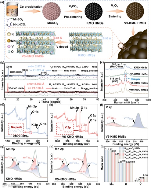 图1. (a) 样品合成示意图。(b) Rietveld精修XRD图。(c) 拉曼图。(d-h) XPS图。(i) 通过ICP-AES计算得出的Mn, K和V元素的摩尔比。