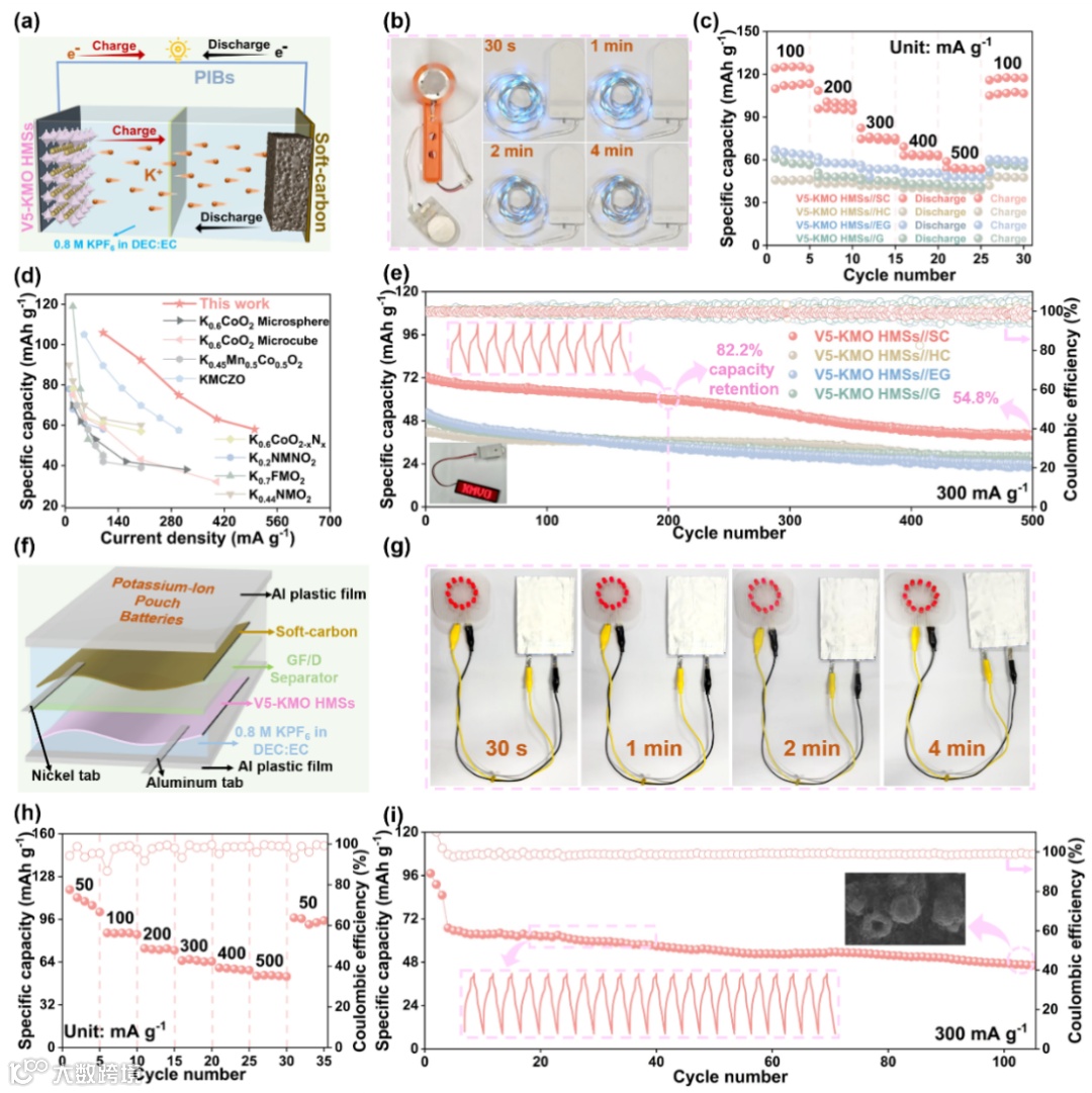 将V5-KMO HMSs与软碳负极成功匹配组装成纽扣型全电池后,体系展现出优异的储钾性能和倍率特性。在100、200、300、400和500 mA·g-1的电流密度下,全电池分别实现了105.9、92.3、74.9、63.1和59.8 mAh·g-1的高放电比容量,性能优于多数已报道的同类钾离子全电池体系。为进一步评估V5-KMO HMSs正极的商业化潜力与实际应用可行性,我们以预钾化软碳为负极、0.8 M KPF6 in DEC:EC为电解液、GF/D玻璃纤维为隔膜,成功构建了软包电池。该软包电池能够顺利驱动串联LED灯泡,并在连续照明4分钟后依旧保持高亮度,直观展示了其优异的电化学性能和应用实用性。这一成果表明,V4+掺杂调控策略不仅显著提升了电极材料的储能动力学,更为PIBs的大规模应用提供了有力的技术支撑与实验验证。