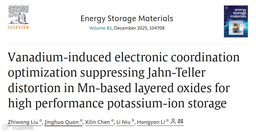 近日,来自暨南大学的李宏岩课题组在国际知名期刊Energy Storage Materials上发表了题为“Vanadium-Induced Electronic Coordination Optimization Suppressing Jahn-Teller Distortion in Mn-Based Layered Oxides for High Performance Potassium-Ion Storage”的研究成果。该研究成果揭示了钒的引入通过形成更短、更强的V–O键,促进了过渡金属–氧(TM–O)层的有序压缩并扩大层间距;与此同时,局部电荷分布的重构增强了Mn–O键合强度,从根本上抑制了Jahn–Teller效应的发生,显著提升了层状结构的整体稳定性与循环耐久性。
