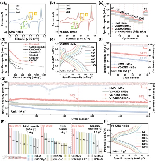 图3系统展示了KMO HMSs与V5-KMO HMSs电极的钾离子储存性能,结果表明,V5-KMO HMSs在倍率性能与循环稳定性方面均表现出显著优势。在电流密度为50、100、200、300、400、500和1000 mA g-1时,V5-KMO HMSs的可逆容量分别达到117.0、110.1、100.3、91.4、81.2、72.7和67.9 mAh g-1。在高倍率1000 mA g-1条件下循环250次和500次后,其容量保持率仍高达96%和88%,性能优于多数已报道的同类层状氧化物正极材料。V4+掺杂与中空微球结构的协同效应是性能显著提升的根本原因。一方面,钒与锰的协同调控有效促进了电荷转移动力学,并提供更多电化学活性位点;另一方面,中空微球内部空间可缓冲体积膨胀,减轻循环过程中的结构应力与退化风险。此外,钒的引入能够抑制由Jahn–Teller效应引起的晶格畸变,从而显著增强材料的结构稳健性。总体而言,V4+掺杂与形貌调控的协同策略为提升层状氧化物正极在PIBs中的循环稳定性与倍率性能提供了有力途径,展现出优异的应用潜力与科学价值。