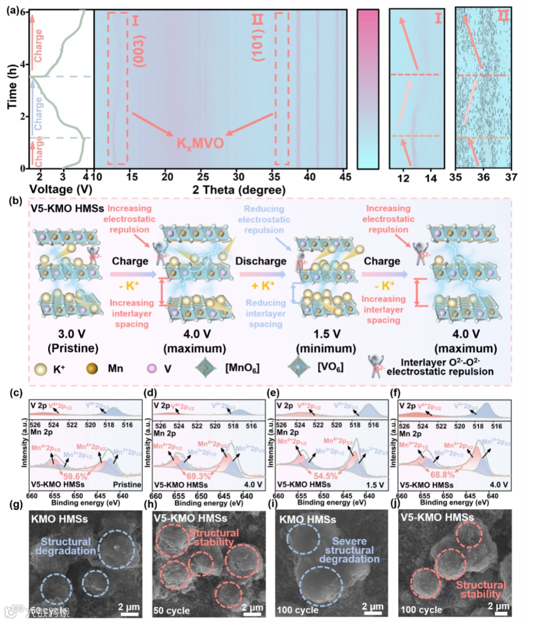 通过原位XRD技术揭示了V5-KMO HMSs在电化学循环过程中的结构演变规律。结果表明,材料在经历一个半循环后仍能保持出色的结构可逆性,未出现新相生成或原相消失,充分证明其层状骨架具备高度的结构稳定性。同时,利用非原位XPS技术对V5-KMO HMSs中不同电化学状态下的过渡金属价态变化进行了系统分析。结果显示,Mn3+/Mn4+氧化还原对在充放电过程中表现出优异的可逆性:充电阶段,K+从层间脱出,Mn3+被氧化为Mn4+以实现电荷补偿;放电阶段,K+重新嵌入层间,Mn4+被还原为Mn3+。这种高可逆的氧化还原转变在确保层状框架稳定性的同时,实现了高效电荷存储。相比之下,V 2p光电子谱在整个循环过程中未出现明显的能级偏移或峰形变化,表明V4+在电化学反应中保持惰性,与循环伏安结果高度一致。其电化学稳定性源于V4+相对稳定的电子构型(3d1),单个d电子占据低能轨道,不易在工作电位范围内发生氧化还原反应。该研究从电子结构层面揭示了V4+掺杂在增强层状框架稳定性与循环寿命方面的关键作用,为高稳定性PIBs正极材料的理性设计提供了重要参考。