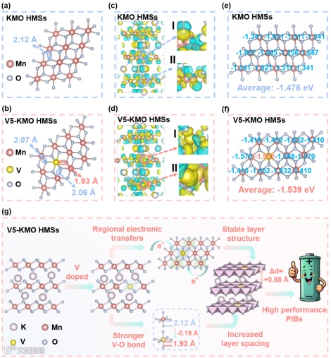 DFT计算进一步揭示了钒掺杂抑制 Jahn–Teller效应的深层机理。研究发现,钒的引入通过形成更短、更强的V–O键,促进了TM–O层的有序压缩,同时适度增大了层间距,从而在结构层面实现了应力缓释。与此同时,V掺杂通过重构局部电荷分布并强化Mn–O键合,有效削弱了Jahn–Teller效应,显著提升了层状结构的整体稳定性。此外,理论计算结果还表明,V掺杂在原子尺度上明显增强了K⁺的扩散动力学,降低了离子迁移势垒。这一系列计算结果充分说明,在过渡金属位点引入钒是一种高效且可行的电子结构调控策略,不仅有助于稳定层状框架结构,还能加速离子传输过程,为开发兼具高稳定性与高能量密度的PIBs正极材料提供了坚实的理论依据和设计指导。