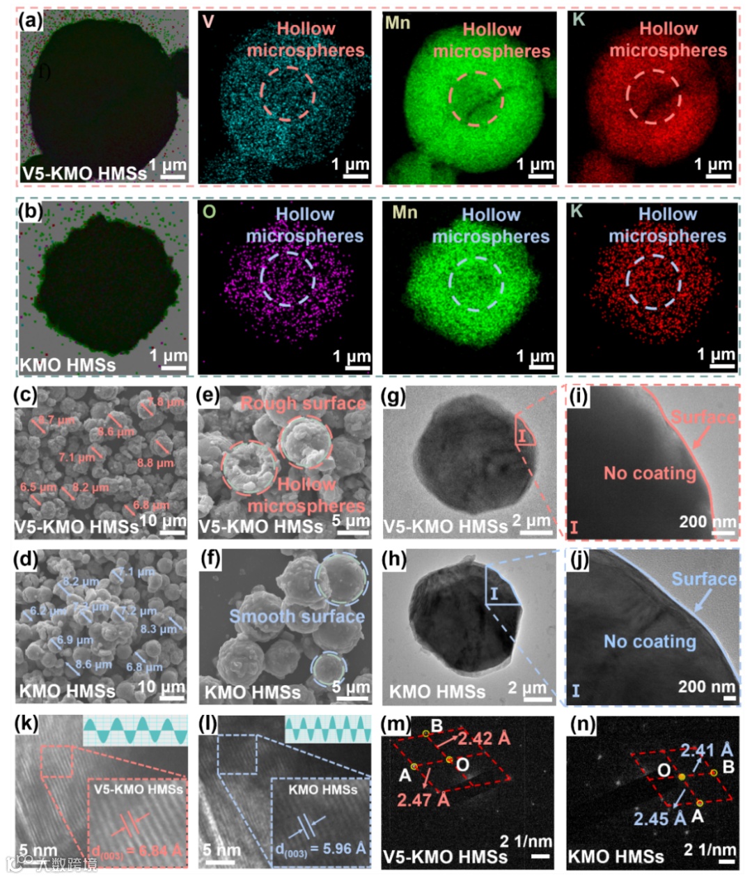 EDS分析结果显示,材料呈现规则的中空微球形貌,V、Mn、K和O元素在活性物质中均匀分布,直接证明了钒元素的成功掺入。该中空微球结构能够有效缓冲充放电过程中产生的体积膨胀与收缩,进而提升电化学反应的均匀性与结构稳定性。SEM图像进一步证实,KMO HMSs与V5-KMO HMSs均保持良好的球形形貌,并呈现明显的中空特征。HRTEM分析揭示,两种样品表面形态高度一致,未观察到任何包覆层或杂相生成,表明V4+以掺杂形式稳定嵌入层间,而非在表面形成二次相。通过HRTEM衍射获得的FFT图谱可见,KMO HMSs与V5-KMO HMSs均展示出清晰、对称的衍射斑点,体现了P2型层状结构的有序堆叠特征。根据FFT点位计算得到KMO HMSs和V5-KMO HMSs的层间距分别为5.96 Å和6.84 Å,对应于(003)晶面。这一结构变化趋势与Rietveld精修得到的c轴晶格参数增大结果高度一致,进一步验证了V掺杂引发的结构稳定化与离子传输协同增强效应。该现象可归因于V4+相较Mn3+更小的离子半径及更强的静电吸引作用,使得局部MnO6八面体发生轻微收缩,从而诱导整体层间距扩张。层间距的有效扩大不仅为K+的可逆插入/脱出提供了更为通畅的扩散通道,也显著提升了材料的离子迁移动力学与倍率性能,为实现高稳定性、高倍率钾离子储能提供了关键结构依据。