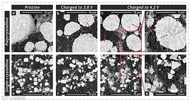 在原子尺度上,NCM材料的失效主要表现为阳离子混排和氧空位的形成。阳离子混排是指锂离子(Li⁺)和镍离子(Ni²⁺/Ni³⁺)在晶体结构中的位置交换,这种混排现象会阻碍锂离子的正常传输路径,增加锂离子扩散的活化能,从而降低电池的电化学性能。氧空位的形成则与材料在高电压充电过程中的氧化还原反应有关,氧空位的出现会进一步破坏晶体结构的稳定性,导致晶格参数的变化,加速材料的结构退化。此类原子尺度上的缺陷不仅影响了材料的电子结构,为后续的颗粒尺度和电极尺度上的失效埋下了隐患。在颗粒尺度上,NCM材料的失效表现为颗粒内部和颗粒间的微裂纹,以及颗粒的粉碎。这类微裂纹通常起源于颗粒内部的应力集中区域,如晶界和缺陷处。随着循环次数的增加,微裂纹会逐渐扩展,最终导致颗粒的粉碎。颗粒的粉碎不仅增加了材料的比表面积,使更多的活性表面暴露在电解液中,加速了与电解液的副反应,还破坏了颗粒之间的电子和离子传输路径,降低了电极的整体导电性和离子传输效率。此外,颗粒粉碎还会导致电极结构的松散,进一步影响电池的机械稳定性和电化学性能。在电极尺度上,NCM材料的失效表现为活性材料从集流体上的剥离,以及导电/粘结网络的退化。活性材料的剥离主要是由于颗粒尺度上的微裂纹和粉碎导致的机械稳定性下降,以及电极在充放电过程中的体积膨胀和收缩。机械变化会削弱活性材料与集流体之间的粘附力,导致活性材料从集流体上脱落,从而失去电接触。导电/粘结网络的退化则与颗粒尺度上的结构损伤密切相关。颗粒的粉碎和微裂纹会破坏导电剂和粘结剂之间的接触,导致电子传输路径的中断和离子传输通道的堵塞。此外,电解液的分解产物也会在电极表面形成绝缘层,进一步阻碍电子和离子的传输。这些电极尺度上的失效现象不仅影响了电极的整体性能,还可能导致电池内部的局部过热和短路,从而影响电池的安全性。在多尺度上,NCM材料的失效还涉及相变和副反应,这些过程进一步加剧了材料的退化。