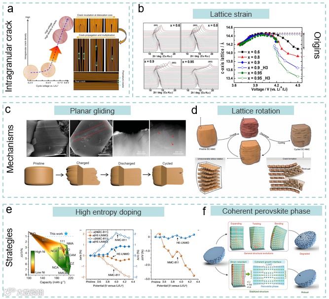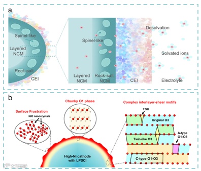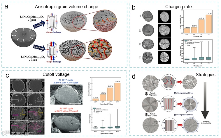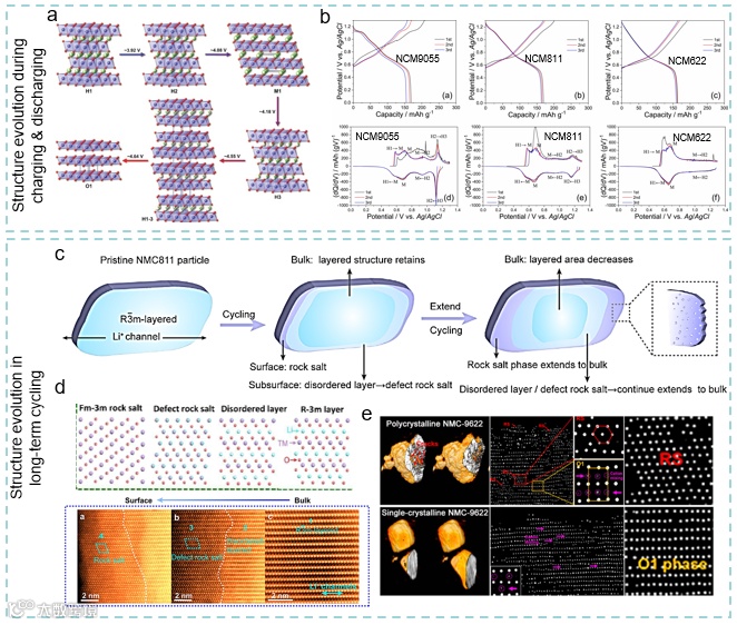 锂离子电池(LIBs)因其高能量密度、长循环寿命和良好的安全性,在电动汽车和便携式电子设备中得到广泛应用。正极材料是影响电池性能的关键因素之一,其中镍钴锰(Ni-Co-Mn)三元层状正极材料(LiNixCoyMn1-x-yO2,简称NCM)因其高能量密度、可调节的电压平台和良好的倍率性能,已成为电动汽车电池的主流正极材料。然而,NCM氧化物在实际应用中面临失效的问题,严重限制了其大规模应用。NCM正极材料的失效是一个复杂的多尺度过程,涉及原子、颗粒和电极等多个尺度上的结构退化,这些退化过程由机械、化学和电化学因素的相互作用驱动,难以解耦,最终影响电池的活性、寿命和安全性。因此,深入理解NCM材料的失效机制,不仅有助于优化现有材料的性能,还可以为开发新型高性能正极材料提供理论支持,同时为废弃电池的高效回收和再利用提供科学依据,推动LIBs技术的可持续发展。
