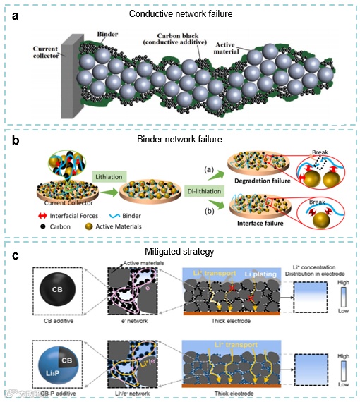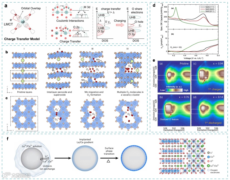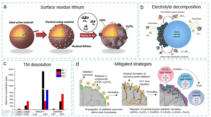 NCM正极的降解是一个渐进的多尺度过程,其中原子水平的不稳定性通过颗粒和电极尺度级联,最终恶化电化学性能在原子尺度上,电荷补偿期间电子结构的不可逆变化(主要由TM氧化和氧二聚化驱动)使晶格不稳定,导致阳离子混合和氧损失。这些过程产生晶格缺陷,如氧空位和TM反位,这削弱了结构完整性并改变了电荷分布。随着持续的循环,这些晶格畸变在颗粒尺度上积累,产生各向异性晶格应变,该应变集中在晶界和初级颗粒内。当应变超过晶格弹性极限时,会导致晶内和晶间微裂纹、颗粒粉碎和相变,进一步破坏微观结构的稳定性。颗粒完整性的降低会损害锂离子和电子的传输,增加电极极化,并暴露新鲜的反应性表面,加速寄生副反应,如电解质分解和表面膜形成。在电极尺度上,这些颗粒尺度的损伤可进一步导致界面电阻升高和导电/粘合剂网络退化。随着电流分布变得越来越不均匀,反应不均匀性加剧,因此,原子尺度上的不可逆电子结构演化是根本原因,引发了一系列结构和电化学故障,这些故障通过尺度向上传播。