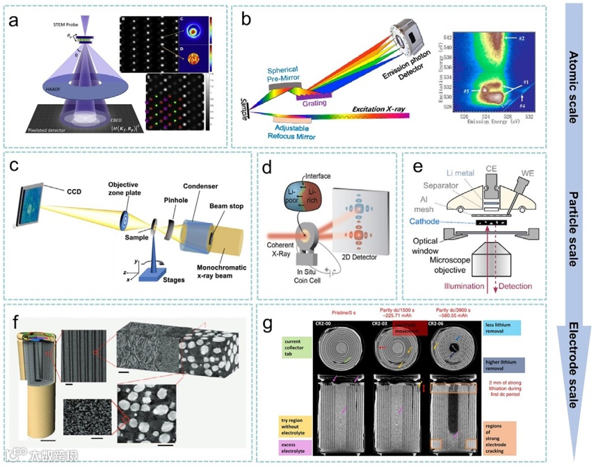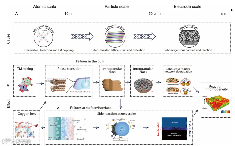 图1 三元正极材料在电池使用过程中的失效机理,从原子尺度到颗粒尺度,再到电极尺度