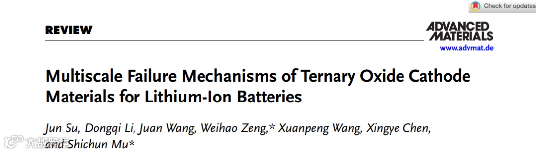 近日,来自武汉理工大学的木士春教授,曾炜豪助理研究员团队在国际知名期刊Advanced Materials上发表题为“Multiscale Failure Mechanisms of Ternary Oxide Cathode Materials for Lithium-Ion Batteries”的综述文章。该综述文章阐述了发生在三元正极上各个尺度的失效机制(原子-颗粒-电极),揭示了这些失效机制之间的耦合与相互作用,同时对每个尺度上的新兴表征手段进行了介绍,并提出了跨尺度研究三元正极失效机理面临的挑战及相应对策。硕士研究生苏俊为论文第一作者。