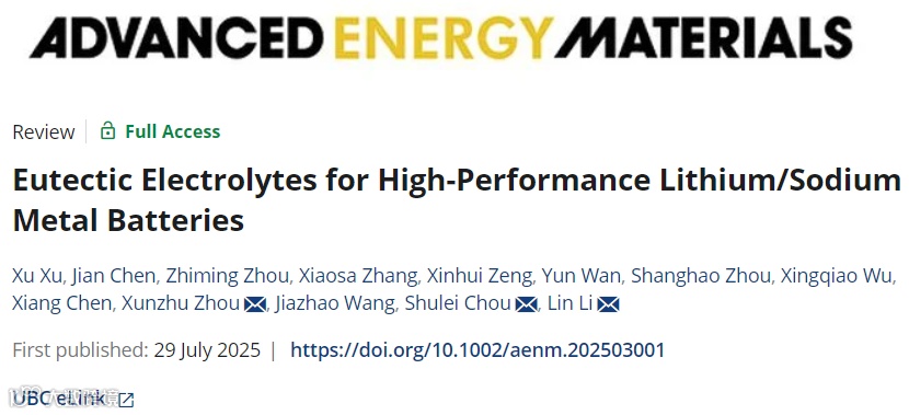 X. Xu, J. Chen, Z. Zhou, X. Zhang, X. Zeng, Y. Wan, S. Zhou, X. Wu, X. Chen, X. Zhou, J. Wang, S. Chou, L. Li, Eutectic Electrolytes for High-Performance Lithium/Sodium Metal Batteries. Adv. Energy Mater. 2025, 2503001.