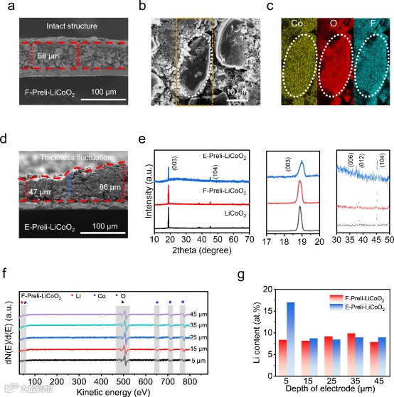 图2 F-Preli-LiCoO2的表征结果。a. 转化比为 7% 的F-Preli-LiCoO2的截面SEM图像。b、c. F-Preli-LiCoO2的俯视SEM图(b)及对应的EDS图(c)。d. E-Preli-LiCoO2的截面SEM图。e. LiCoO2、F-Preli-LiCoO2与E-Preli-LiCoO2电极的XRD谱图。f. F-Preli-LiCoO2在不同深度处的AES谱图。g. 通过AES测定的F-Preli-LiCoO2和E-Preli-LiCoO2在不同深度处的锂原子含量。