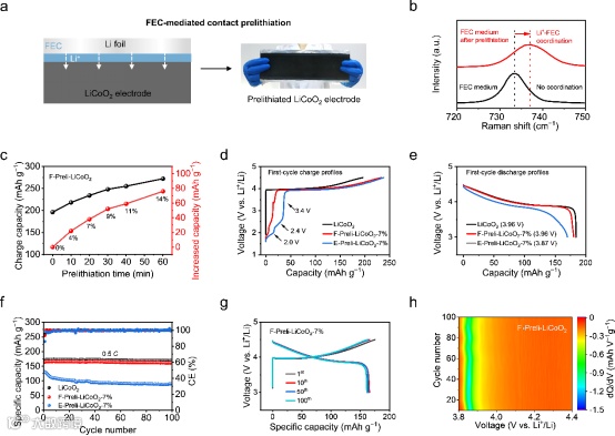 图1. 使用FEC介质对LiCoO2电极进行可控接触预锂化。a. 以FEC为介质的接触预锂化方法示意图。b. 预锂化反应前后FEC介质的Raman光谱。c. F-Preli-LiCoO2电极在不同预锂化时间下的首次循环充电比容量及容量增量对比。d-f. LiCoO2、F-Preli-LiCoO2与E-Preli-LiCoO2电极的首次循环充电曲线(d)、首次循环放电曲线(e)及相应的循环性能曲线(f)。g. F-Preli-LiCoO2在0.5 C倍率循环过程中的电压曲线。h. F-Preli-LiCoO2放电过程的dQ/dV曲线。