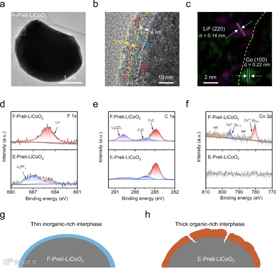 图3 F-Preli-LiCoO2的界面结构。a-c. F-Preli-LiCoO2的TEM图(a)、HRTEM)图(b)以及标记区域对应的傅里叶变换图像(c)。d-f. F-Preli-LiCoO2与E-Preli-LiCoO2的高分辨F 1s(d)、C 1s(e)及Co 2p XPS 谱图(f)。g-h. F-Preli-LiCoO2(g)与E-Preli-LiCoO2(h)的界面结构示意图。