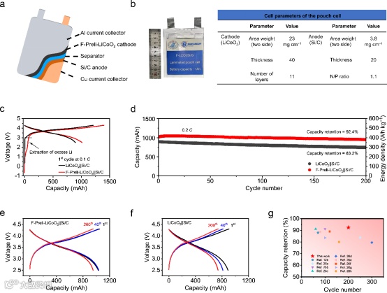 图5 F-Preli-LiCoO2||Si/C软包电池的电化学性能。a. 软包电池结构示意图。b.软包电池的实物照片及相应参数。c、d. 叠片式Ah级F-Preli-LiCoO2||Si/C软包电池与未预锂化的LiCoO2||Si/C软包电池的首次循环电压曲线(c)及相应的循环性能曲线(d)。e、f. F-Preli-LiCoO2||Si/C软包电池(e)与未预锂化的LiCoO2||Si/C 软包电池(f)在0.2 C倍率循环过程中的电压曲线。g. 该软包电池与已报道的采用硅基负极的软包电池在长期循环性能上的对比