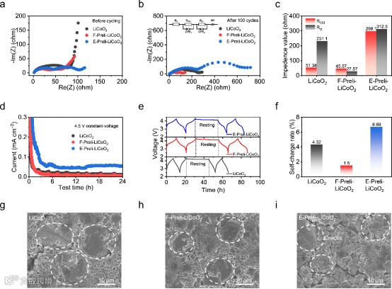图4 F-Preli-LiCoO2的电化学行为。a-c. LiCoO2、F-Preli-LiCoO2与E-Preli-LiCoO2电极在循环前的EIS谱图(a)、循环100次后的EIS谱图(b),以及拟合得到的Rct与RCEI的对比图(c)。d. 三种LiCoO2电极在4.5 V恒压浮充测试中的漏电流对比。e-f. 采用Si/C负极与经预锂化/未预锂化LiCoO2正极组装的全电池,在0.1 C倍率充电、静置24 h后的电压曲线(e),以及各全电池自放电率的对比图(f)。g-i. LiCoO2电极(g)、F-Preli-LiCoO2电极(h)与E-Preli-LiCoO2电极(i)在循环100次后的SEM图。