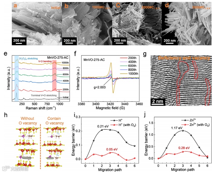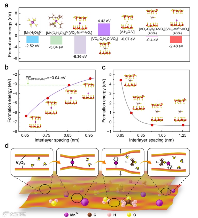MnVO-275-AC正极的循环性能与结构演变共同揭示了一种自适应转变过程,该过程与Mn2+离子和电化学活性AC分子对层状V2O5·nH2O框架的动态调控密切相关。为深入解析其内在机制,我们系统评估了Mn²⁺与AC共插层过程的能量分布(图5)。结果表明,Mn2+离子作为结构支柱有效稳定了VOx骨架,而AC分子不仅引入了额外的氧化还原活性位点,还调控了Mn2+–VOx键的配位强度。这种协同作用触发了循环过程中动态、自适应的结构重组,具体表现为正极材料微观形貌的优化,层间距的逐步扩展,V=O键合的转变与氧空位的持续生成(图6)。在此过程中,新的电化学活性位点被不断激活,从而实现比容量的自适应提升。该发现突破了传统认知中将电极结构视为循环过程中静态不变体的局限,为理解电极动态演化机制提供了新的理论视角。