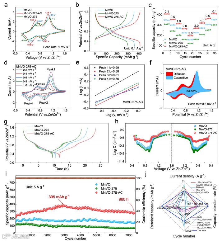 图4:MnVO、MnVO-275 和 MnVO-275-AC 正极的电化学性能。