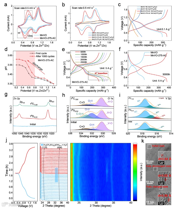 得益于Mn2+/AC共插层体系的自适应H+嵌入机制,MnVO-275-AC正极材料展现出卓越的电化学性能。在0.1 A g−1的电流密度下,其比容量高达409 mAh g−1;即便在5 A g−1的大电流条件下,比容量仍随循环进行逐步提升,3000次循环后达到379 mAh g−1。尤为突出的是,经历7400次循环后仍保持279 mAh g−1的可逆容量,容量保持率高达126.8%(图4i),该性能优于大多数已报道的钒基正极材料(图4j)。这一系列结果充分表明,所提出的协同插层策略对于开发兼具高比容量与优异循环稳定性的高性能水系锌离子电池具有重要的实践价值。