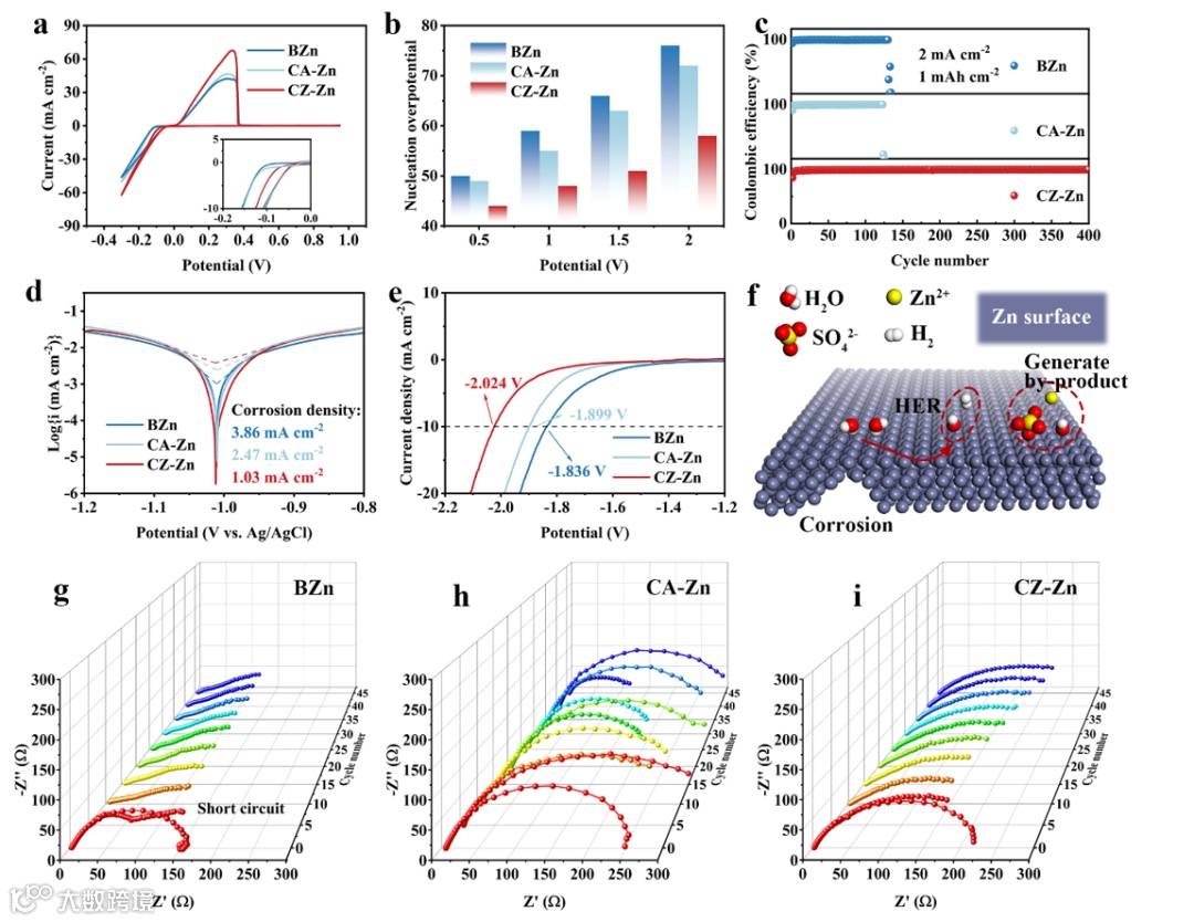 图3. (a) Cu//Zn不对称电池的循环伏安测试;(b) Cu箔上Zn2+的成核过电位; (c) Cu//Zn非对称电池的CE测试;(d) 阳极塔菲尔测试;(e) 阳极线性扫描伏安测试;(f) CA-Zn与BZn表面副反应示意图;(g~i) BZn、CA-Zn及CZ-Zn对称电池的原位电化学阻抗谱(5 mA cm-2,1 mAh cm-2)。