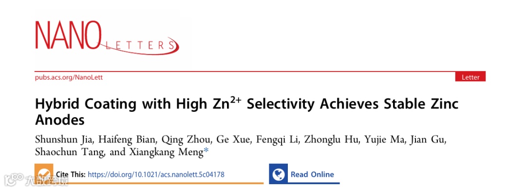 近日,南京大学孟祥康教授在国际知名期刊Nano Letters上发表题为“Hybrid Coating with High Zn2+ Selectivity Achieves Stable Zinc Anodes”的研究文章。该工作围绕一种具有高锌离子选择性的复合涂层,研究了涂层在电池循环过程中的离子调节能力。