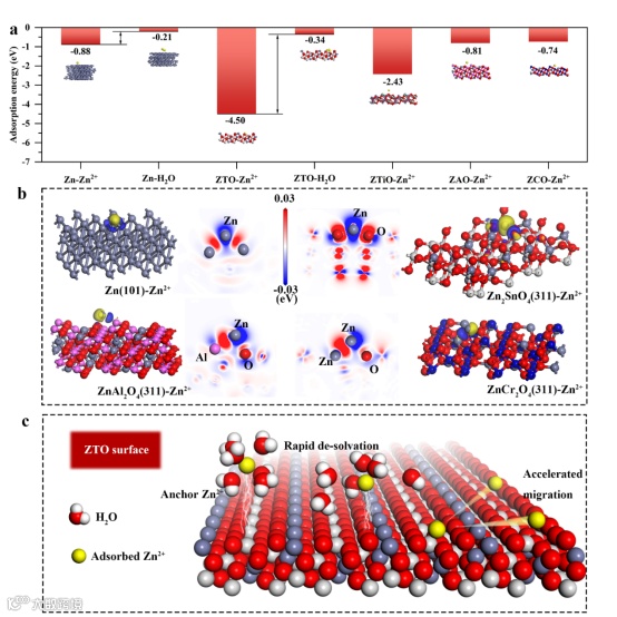 图1. (a) Zn2+或H2O在不同晶体上的吸附能;(b) 吸附于Zn、Zn2SnO4、ZnAl2O4和ZnCr2O4表面的Zn2+电荷密度差;(c) 离子调控作用对ZTO表面影响的示意图。