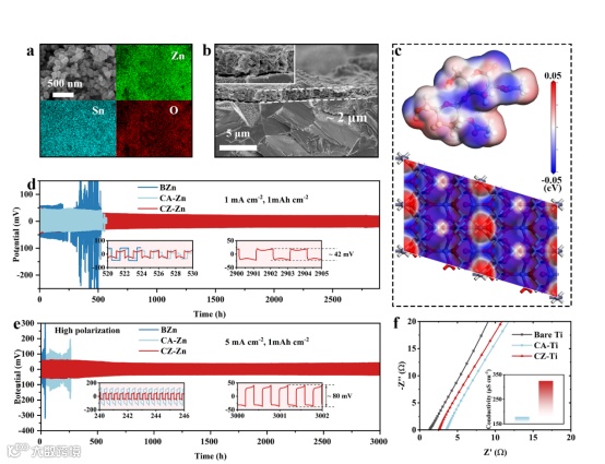 图2a展示了制备的ZTO纳米颗粒的扫描电子显微镜(SEM)和能量色散光谱(EDS)图像,证实材料中存在Zn、Sn和O元素。将纳米ZTO与CA结合可兼顾两者优势,从而对涂层保护产生协同效应。CA/ZTO(CZ)涂层厚度达2 µm,分布均匀,且CA与ZTO实现良好整合。图2c展示了含两个重复单元的CA结构中静电势分布。静电势在CA结构中呈现不均匀分布,形成多个电负性区域(蓝色区域,由C=O基团产生)和电正性区域(红色区域)。这些区域有利于与溶解的Zn2+相互作用,从而增强结合强度。此外,CA表面这些路易斯碱位点(蓝色区域)与ZTO中的阳离子产生强静电作用,从而增强涂层强度。图2d和2e展示了在1和5 mA cm-2电流密度下对称电池的循环测试结果,CZ对称电池表现出约3000小时的卓越工作寿命。此外,CZ-Zn在1和5 mA cm-2电流密度下的极化电位仅分别为42 mV和80 mV。CA-Zn与裸Zn(BZn)电极表面离子迁移效率低下,导致难以在高电流下维持电池稳定性,从而产生显著的电池极化现象。这归因于致密CA涂层不利于Zn2+迁移。然而,ZTO的掺入降低了CA组分比例,形成更疏松的结构。ZTO的掺入可提升Zn2+迁移效率。