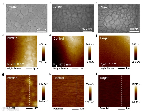 图3. 宽带隙钙钛矿薄膜的表面粗糙度和接触电势分析。
