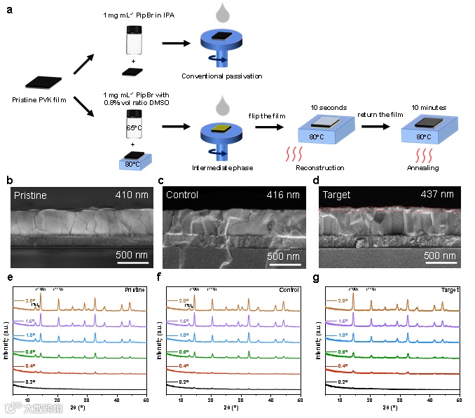图1. 通过残留溶剂辅助表面重构策略在钙钛矿薄膜上形成空间均匀的哌嗪/钙钛矿杂化表面。