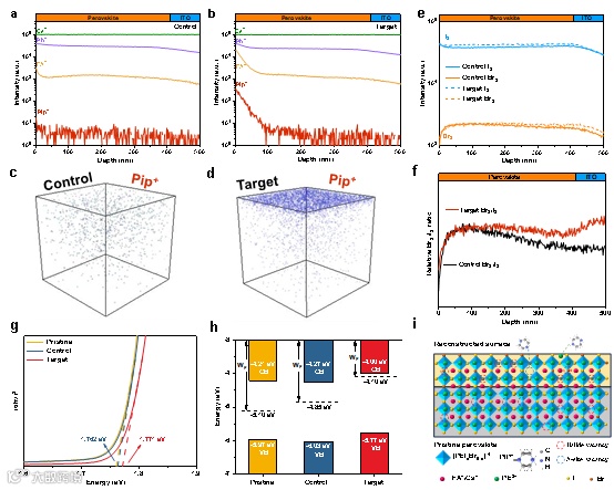 飞行时间二次离子质谱图显示,RSSR策略可促使钝化分子(Pip⁺)渗透钙钛矿薄膜表面,形成厚度达 80 nm 的高质量梯度钝化层。同时,该策略引入的溴(Br)离子实现了表面溴补偿,有效促进卤素均匀分布。吸收光谱、光致发光光谱、X 射线光电子能谱及广角 X 射线衍射结果一致证实,Br 元素通过补偿作用成功进入钙钛矿晶格,不仅提升了材料带隙,还填补了碘空位缺陷。紫外光电子能谱测试表明,RSSR策略使钙钛矿薄膜表面形成高度n型掺杂状态,这一状态既有利于电子提取,又能有效阻挡空穴的反向传输。此外,扫描电子显微镜平面图、原子力显微镜形貌图及电势图均显示,经RSSR策略处理后的钙钛矿薄膜质量显著提升,表面粗糙度降低,接触电势差也变得更均匀。