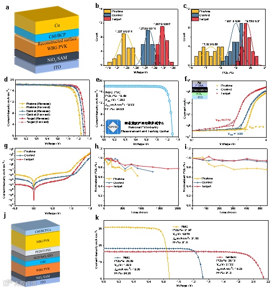 图4. 宽带隙钙钛矿太阳能电池及全钙钛矿叠层太阳能电池的光伏性能与表征。