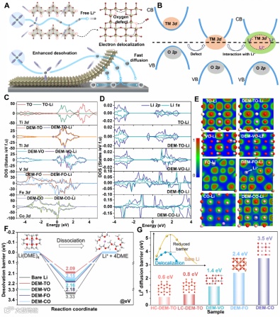 通过联合电子态密度(DOS)、电子定域函数(ELF)、差分电荷密度(CDD)等模拟手段阐明离域电子与离子-偶极的作用关系。进一步模拟和筛选不同离域电子结构(DEM-TMOs@C,M= Ti, V, Fe, Co)对Li(DME)4+脱溶剂的能垒影响及对Li原子扩散的促进作用(图1)。