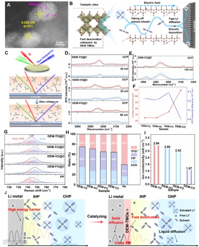 通过界面敏感的原位和频振动光谱(SFG)结合Raman光谱,即SFG-Raman联用,实现了电解质/电极界面处离子-偶极解耦行为的分子级动态追踪,证实离域电子结构通过重构内亥姆霍兹层(IHP)组分,降低脱溶剂能垒促进去溶剂化脱出自由Li+并促进离子快速传输(图2)。