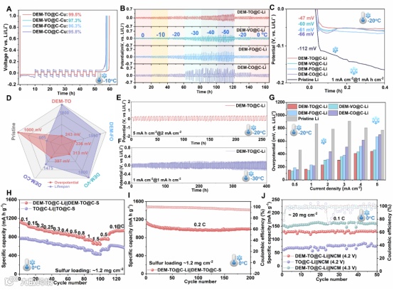 图3 DEM-TMOs@C催化锂金属电池的低温循环和倍率性能