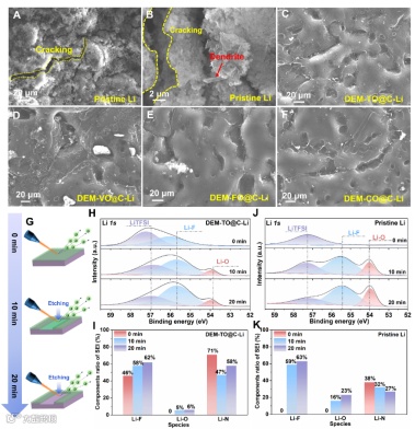 SEM结合in-depth XPS和TOF-SIMS分析表明,DEM-TMOs@C催化的锂金属负极在低温循环后具有光滑无枝晶的表面,界面SEI层薄且均匀完整,表明DEM-TMOs@C催化层的引入有利于重构IHP层,促进Li金属表面生成薄且坚固的富F和N的SEI膜。COMSOL模拟电极界面Li+通量,DEM-TMOs调控的电极具有均匀的电场分布及离子通量,这均得益于离域电子结构对离子-偶极关系的催化解耦作用,优化界面去溶剂化,促进锂离子传输均匀界面离子通量,有利于锂的均匀无枝晶沉积(图4和图5)。