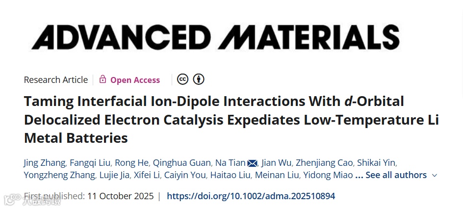 针对上述问题,德国亥姆赫兹电化学研究所王健博士、中科院苏州纳米所蔺洪振研究员联合西安理工大学田娜教授及张静副教授在Advanced Materials上发表题为“Taming Interfacial Ion-Dipole Interactions With d-Orbital Delocalized Electron Catalysis Expediates Low-Temperature Li Metal Batteries”的研究论文。采用电子离域工程催化重构在低温环境下[Li(solvent)x+]基团的溶剂鞘层,快速脱出自由Li离子,加快离子扩散动力学抑制枝晶生成。筛选了一系列d轨道离域的金属氧化物(M= Ti, V, Fe, Co),在系列电极/电解质界面上进行了系统的理论模拟和实验筛选,重点阐述了电子结构优化对调节离子-偶极相互作用调控溶剂化结构,促进离子传输实现低温长寿命锂金属电池的催化机制。
