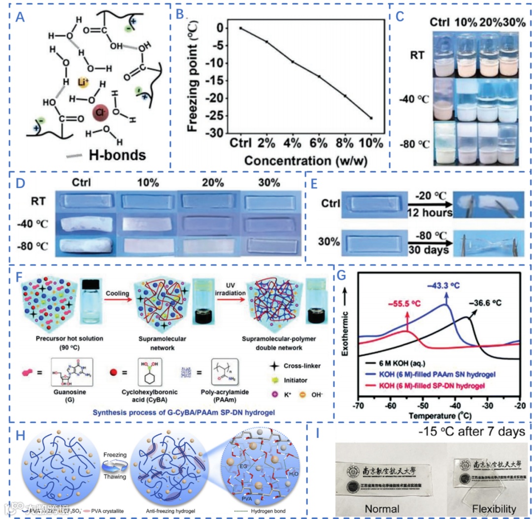 图8. 聚合物电解质:(A) 基于LiCl的水合弹性体示意图,(B) 不同浓度LiCl溶液的凝固点,(C) 纯水与不同浓度LiCl溶液在低温环境中静置12小时后的状态对比,(D) 对照组与含10%~30% LiCl水凝胶在低温环境中静置12小时后的状态对比,(E) 对照组与30% LiCl水凝胶在零下温度处理特定时间后的扭曲形变对比,(F) SP-DN-PAA水凝胶的合成过程,(G) 不同样品的DSC测试结果:6mol/L KOH电解质、6mol/L KOH-SN-PAA水凝胶和6mol/L KOH-SP-DN-PAA(SP-DN指超分子聚合物双网络)水合弹性体,(H) 水合弹性体制备流程示意图,(I) AHE在-15℃冷冻7天后仍保持柔韧性的展示。