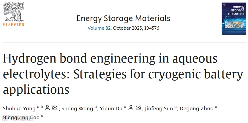 Shuhua Yang, Shang Wang, Yiqun Du, Jinfeng Sun, Degang Zhao, Bingqiang Cao, Hydrogen bond engineering in aqueous electrolytes: Strategies for cryogenic battery applications. Energy Storage Materials, 2025, 82: 104576.