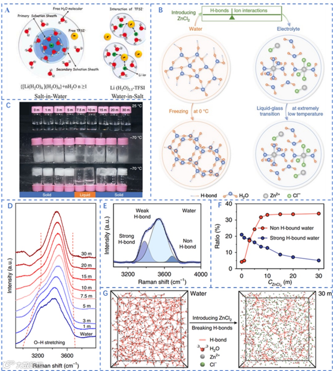 图2. 高浓度电解质:(A) 稀释电解质与盐包水溶液中Li⁺初级溶剂化鞘演化示意图。(B) 水与电解质结构演变示意图及低相变温度溶液的设计原理。原始水分子通过氢键连接的网络在0°C时易转化为冰晶结构;添加ZnCl₂后,离子与水分子间的强相互作用破坏氢键网络,同时增强离子间相互作用。通过平衡氢键与离子相互作用以调控相变温度,临界浓度ZnCl₂电解质可在极低温环境下运行。(C) 不同浓度ZnCl₂电解质在25°C与-70°C下的光学照片。在-70°C时,低/高浓度ZnCl₂电解质均呈固态,而中等浓度(7.5-10 m)电解质仍保持液态。(D) 不同浓度ZnCl₂电解质的O-H伸缩振动谱图。(E) 拟合后的O-H伸缩振动峰分别代表具有强氢键、弱氢键及无氢键作用的水分子。(F) 强氢键水与无氢键水占比统计。(G) 纯水与30 m ZnCl₂电解质的分子动力学模拟瞬态图,其中红线表示氢键。