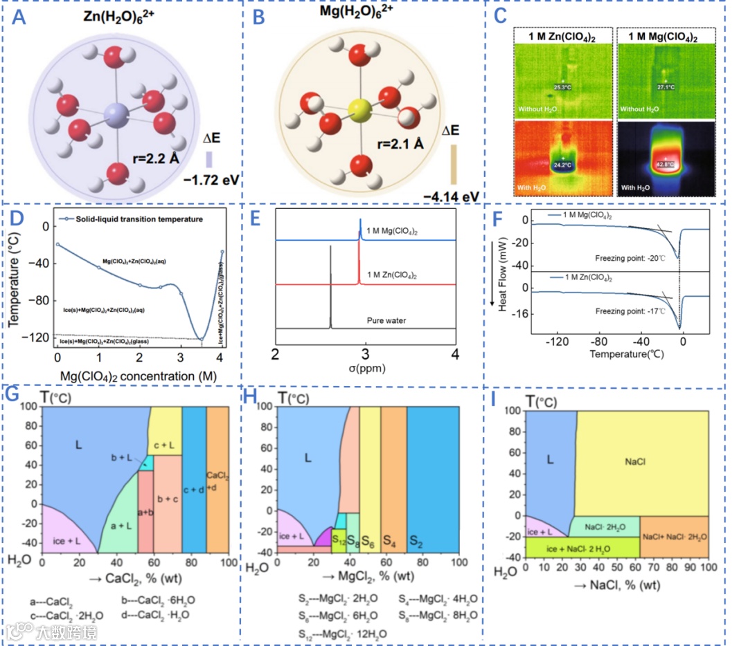 图3. 低共熔溶剂:(A) Zn²⁺溶剂化构型,(B) Mg²⁺溶剂化构型,(C) 不同电解质的红外测温图像,(D) 凝固温度与Mg(ClO₄)₂浓度间的V型关系(0m指代1m Zn(ClO₄)₂溶液),(E) 不同溶液的¹H NMR谱图,(F) 不同溶液的凝固点,(G) H₂O-CaCl₂体系相图,(H) H₂O-MgCl₂体系相图,(I) H₂O-NaCl体系相图。