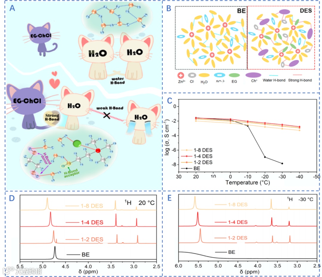 图5. 含有机添加剂的低共熔溶剂电解质:(A) 基于"强键取代弱键"指导思想的氢键演化示意图;(B) 基础电解质(左)与低共熔溶剂(右)中的溶剂化结构;(C) 不同电解质的离子电导率测试结果;(D) 2℃条件下电解质的¹H NMR谱图;(E) -30℃条件下电解质的¹H NMR谱图。