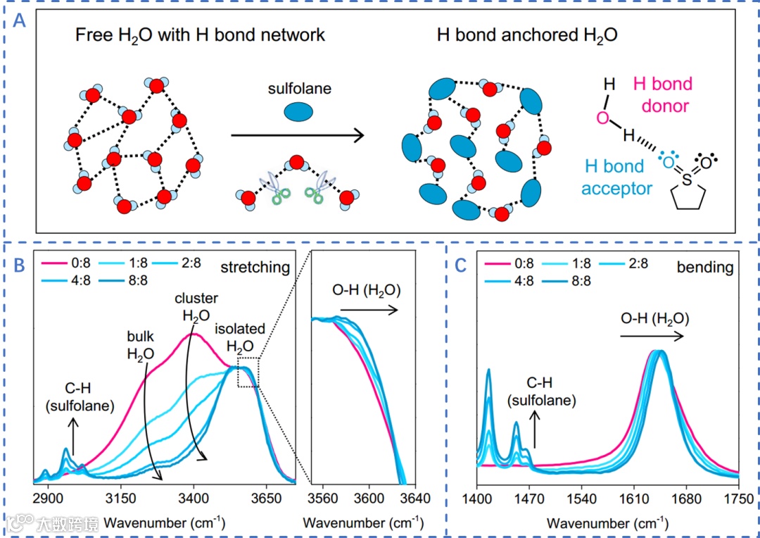 图6. 环丁砜作用机理与傅里叶变换红外光谱:(A) 水分子与环丁砜相互作用示意图;(B) 3.6 mol/L LiTFSI/环丁砜-水(x:8) (x=0,1,2,4,8) 电解质在伸缩振动区的归一化FTIR光谱;(C) 3.6 mol/L LiTFSI/环丁砜-水(x:8) (x=0,1,2,4,8) 电解质在弯曲振动区的归一化FTIR光谱。