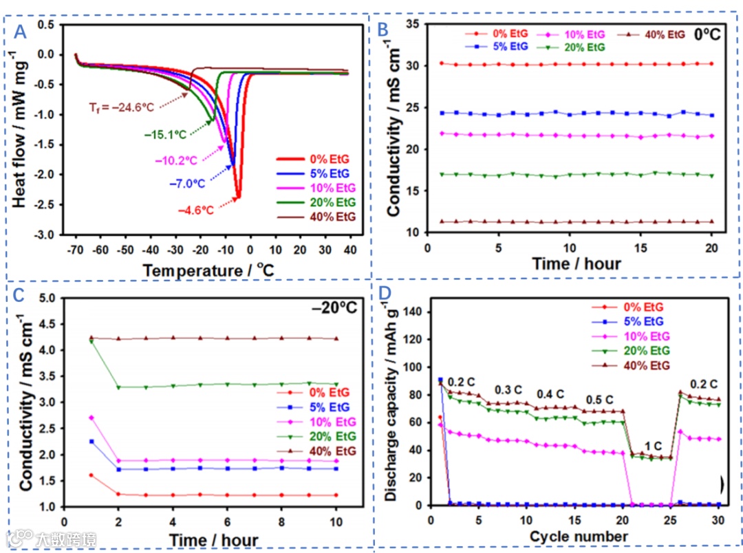 图4. 凝固点与电化学性能测试:(A) 含不同比例防冻添加剂(乙二醇二甲醚,重量百分比:0、5、10、20、40)的水系电解质溶液差示扫描量热分析;(B) 含不同比例防冻添加剂(乙二醇二甲醚,重量百分比:0、5、10、20、40)的1mol/L Li₂SO₄水系电解质溶液与1mol/L LiPF₆ EC/DEC(1:1,体积比)有机电解质在0°C环境下的离子电导率随时间变化曲线;(C) 相同电解质体系在-20°C环境下的离子电导率时效特性;(D) -20°C低温环境下,磷酸铁锂材料在含不同比例防冻添加剂(乙二醇二甲醚,重量百分比:0、5、10、20、40)的水系电解质中,于-0.2~0.8V电位区间在不同充放电电流密度下的倍率性能。