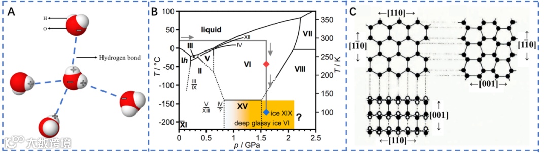 图1. 冰与氢键:(A) 冰的四面体结构,(B) 冰的相图,(C) 六方冰的三视图。