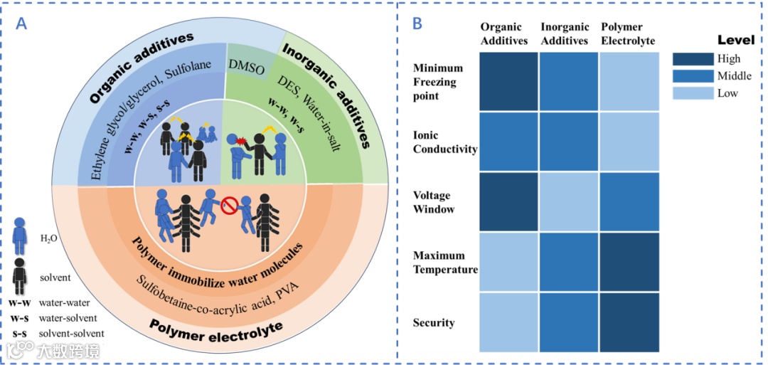 为降低电解质冰点,需阻止水分子氢键网络的形成。图9A展示了添加不同组分时电解质中存在的氢键类型,图9B则对不同调控策略的效果进行了简要对比。图中等级评价表示同一类别中不同策略的综合评估效果,需注意不同等级间存在显著的性能重叠。常用方法归纳如下: