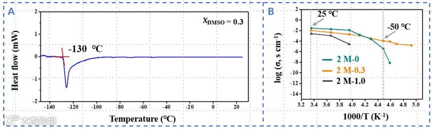 图7. 电解质的电化学测试:(A) 二甲基亚砜体积分数为0.3时电解质溶剂的差示扫描量热数据;(B) 温度对离子电导率的影响研究。