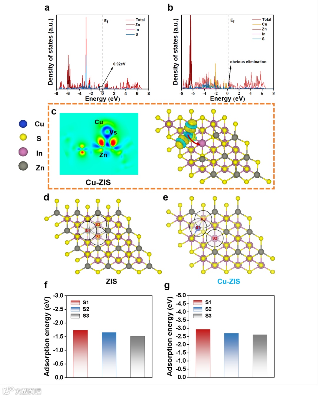 形成能计算结果表明,Cu原子取代Zn原子具有最低的形成能(1.35 eV),说明Cu在晶格中优先占据Zn位点。这一取代行为符合价态与尺寸匹配原则:Cu²⁺与Zn²⁺均呈+2价,且晶体半径相近(Cu²⁺为 0.71 Å,Zn²⁺为 0.74 Å),从而有利于离子取代过程的进行。两种结构中的硫空位形成能显示,ZIS中硫空位的形成能(Ef)为1.62 eV,而Cu-ZIS中仅为0.34 eV。Cu-ZIS中显著降低的硫空位形成能表明Cu的引入会自发诱导S空位的形成。该策略能够有效调控Cu-ZIS的电子结构,进而提升其反应活性。