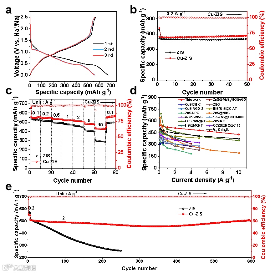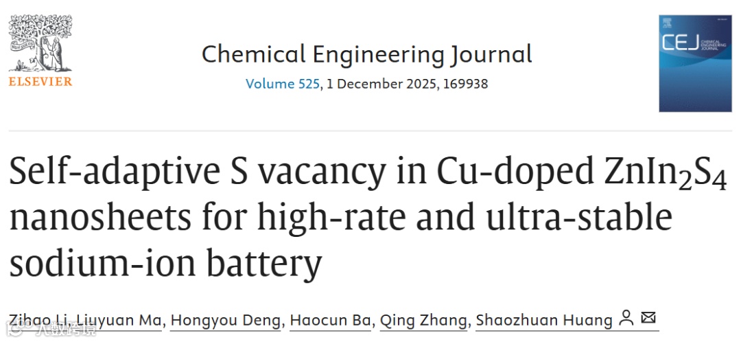 近日,中南民族大学化学与材料科学学院黄绍专教授团队在《Chemical Engineering Journal》杂志上发表了题为“Cu掺杂ZnIn2S4纳米片诱导自适应S空位用于高倍率和超稳定钠离子电池”的文章。该团队2022级本科生李仔豪为该论文第一作者,黄绍专教授为论文通讯作者。针对ZnIn2S4反应动力学缓慢和循环过程中结构易坍塌等问题,本研究通过铜掺杂在ZnIn2S4中引入自适应硫空位 (Vs),并应用于高性能钠离子电池。实验结果和理论计算表明,Vs通过铜原子取代锌位点形成。相比ZnIn2S4负极,Cu-ZnIn2S4(Cu-ZIS)带隙变小并且对Na吸附能增加,从而表现出高电子电导率和优异储钠能力。并且,Vs的形成促进晶体结构畸变,提高晶胞体积,有效减轻钠插入/脱出引起的机械应变。这些改进使Cu-ZnIn2S4实现极其优异的储钠性能。本研究展示了铜取代的行为机理,并系统地研究了异质掺杂诱导缺陷工程对电化学性能的影响,为开发先进的负极材料提供了宝贵的见解。