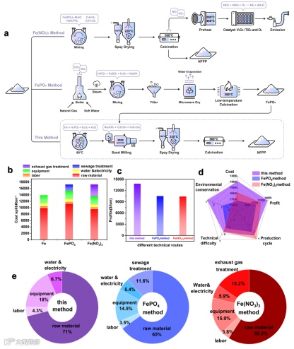 图1. (a) 不同原料的制备工艺示意图;(b) 成本分类;(c) 三条路线的利润计算;(d) 三条路线的综合对比;(e) 每吨 NFPP 正极材料的原料消耗比例。
