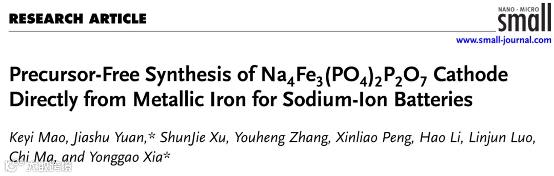 近日,来自中国科学院宁波材料技术与工程研究所的夏永高研究员与宁波工程学院的元家树博士合作在 Small 上发表了题为:“Precursor-Free Synthesis of Na4Fe3(PO4)2P2O7 Cathode Directly from Metallic Iron for Sodium-Ion Batteries”的研究论文。团队提出一种 “铁粉一步法”,无需 FePO4 前驱体,直接以 金属铁+磷酸+H2O2为起点,通过固–液一体化路线一步得到高性能 NFPP/C 正极材料,在成本、环境友好性和电化学性能方面都有突破性优势。