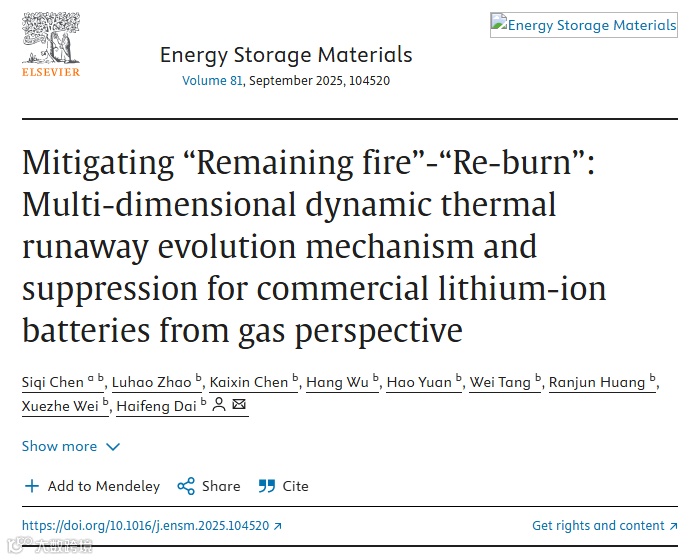 近日,同济大学魏学哲教授、戴海峰教授团队,系统研究探讨了热失控多维动态演化机制和“余烬”-“复燃”演化原理。定性定量揭示了不同绝热热失控阶段的动态产气机理和环境压力演化机制,并提出针对性诊断、抑制方法。此项研究为热失控机制研究提供了新的见解,并为高安全电池系统设计提供了指导,研究成果发表于国际顶级期刊《Energy Storage Materials》。